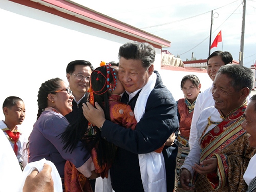 2016年8月22日,习近平总书记考察调研长江源村,离开时,拥抱献上哈达的小姑娘次央拉姆。新华社图片