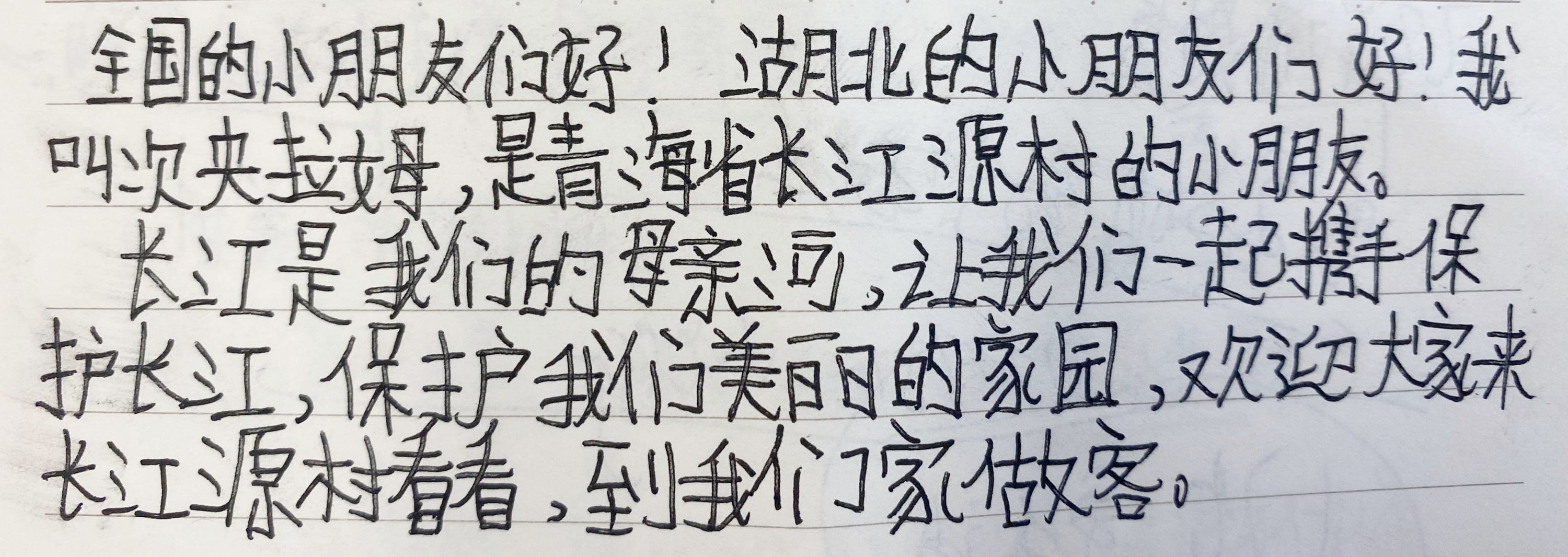 “全国的小朋友们好!湖北的小朋友们好!我叫次央拉姆,是青海省长江源村的小朋友。长江是我们的母亲河,让我们一起携手保护长江,保护我们美丽的家园!欢迎大家来长江源看看,到我们家做客!”