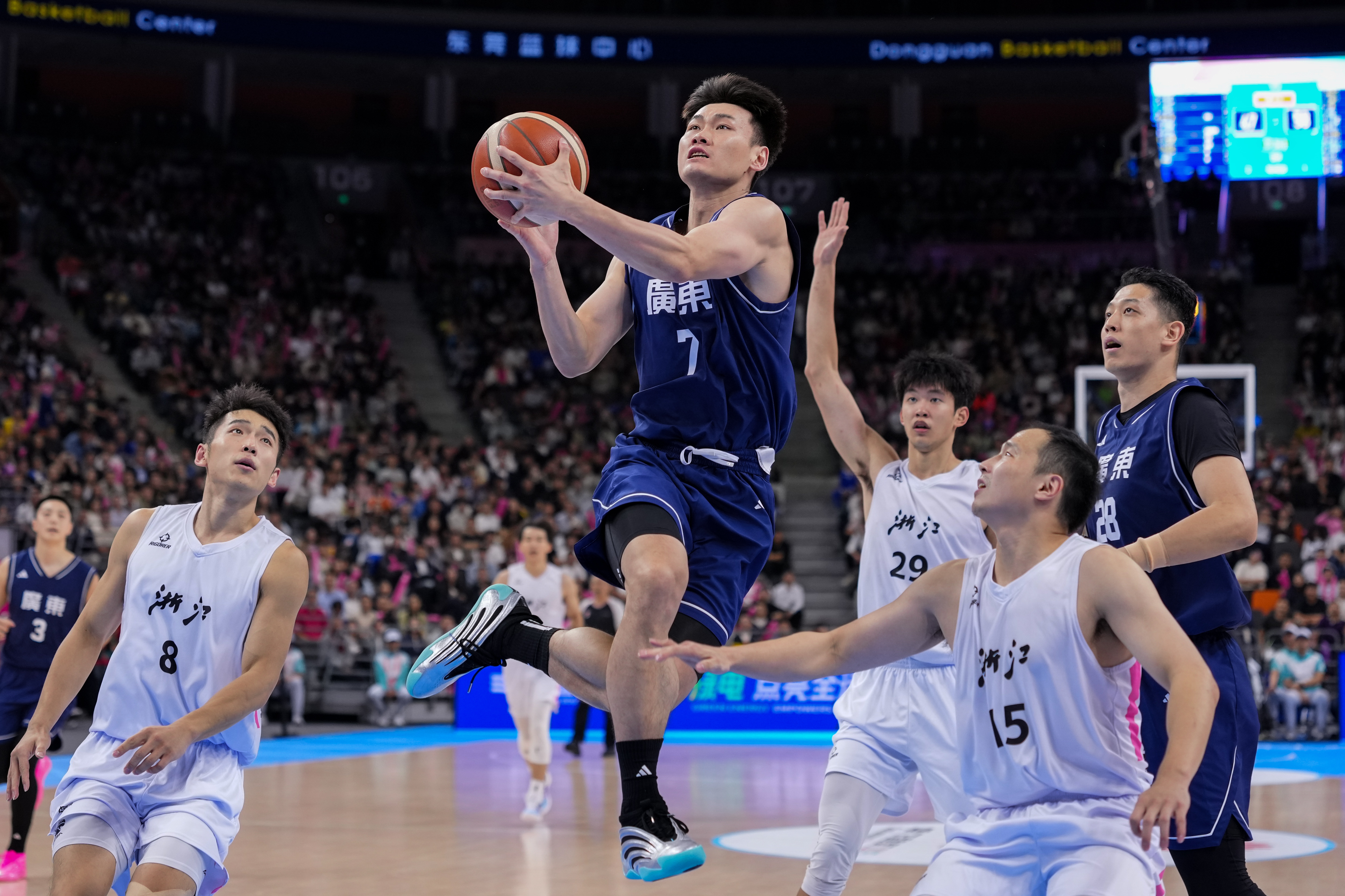 11月12日,广东队球员王睿泽(上)在比赛中突破上篮。图/新华社